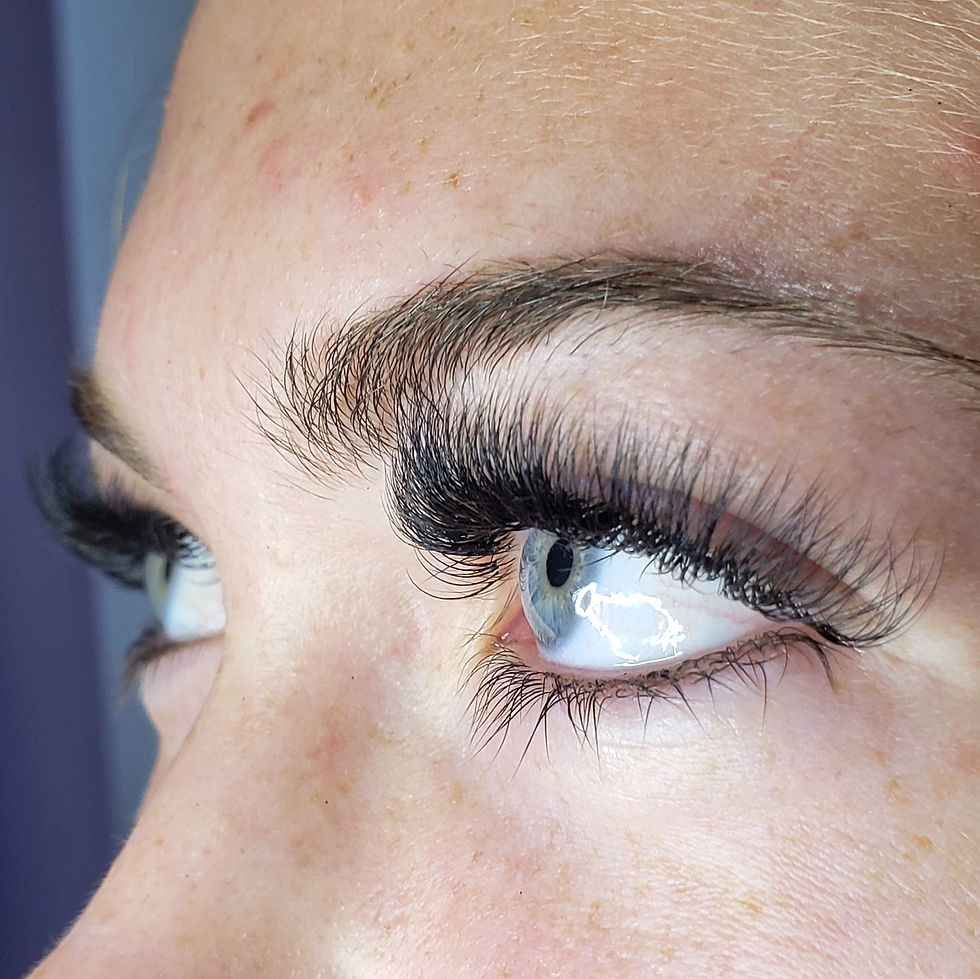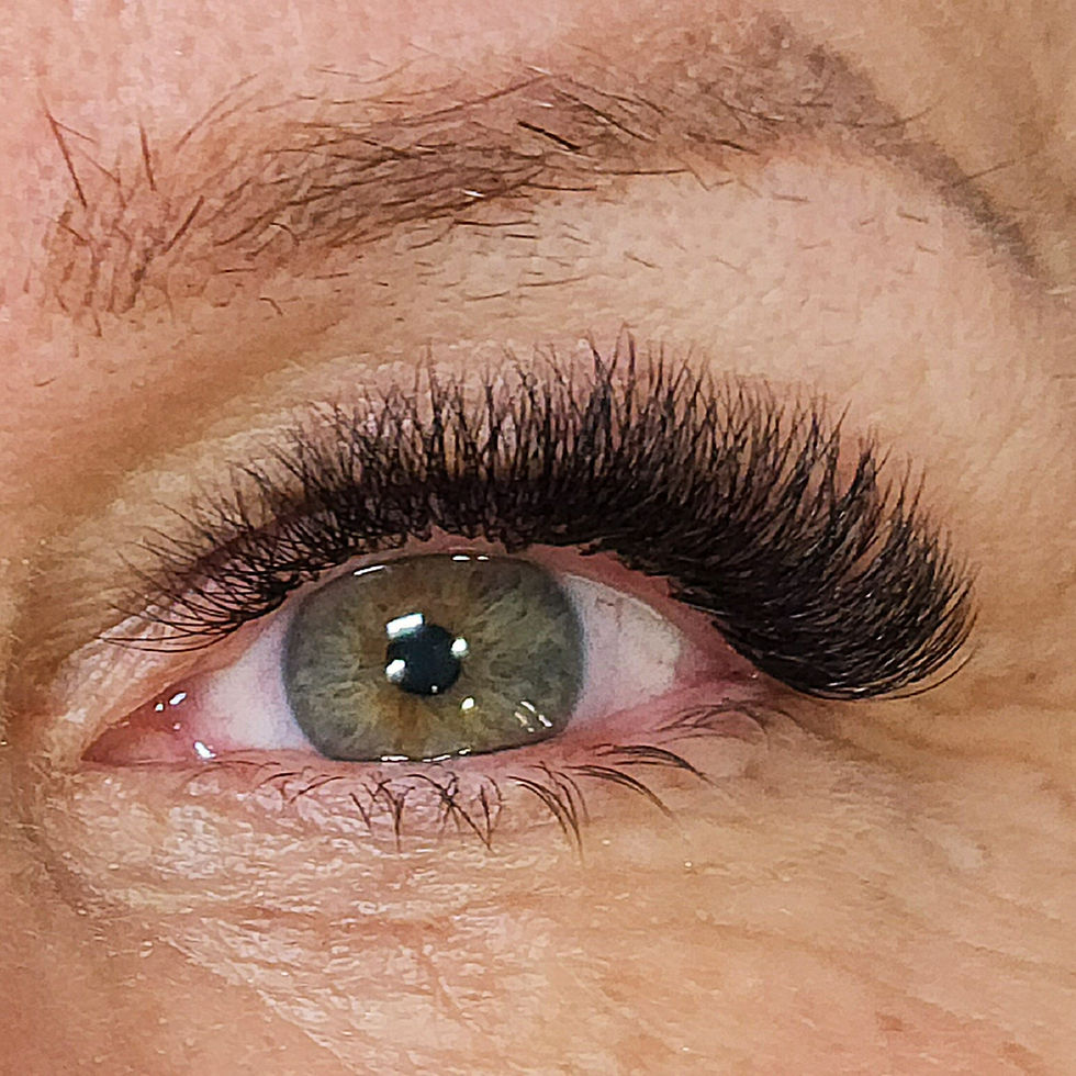 Similar to the look of a Classic Set but bolder. Like the the look of heavy mascara or wet volume extensions. A closed cluster of false lashes are adhered to each natural lash until all healthy lashes have an extension.